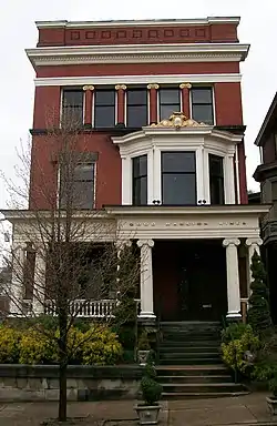 The Good Mansion is a three-story Classical Revival style brick townhouse. It features a full-width porch with pairs and clusters of fluted wooden columns on sandstone plinths. The third story facade has an engaged Ionic order brick colonnade. It has a sumptuous interior.[4]