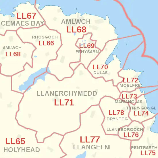 The LL postcode area, also known as the Llandudno postcode area,[2] is a group of 67 postcode districts, within 62 post towns. These cover the majority of north Wales, plus a very small part of west Wales and the English county of Shropshire. The districts start at LL11 so as to avoid confusion with Liverpool postcodes (LL1-9 would resemble L11-19).