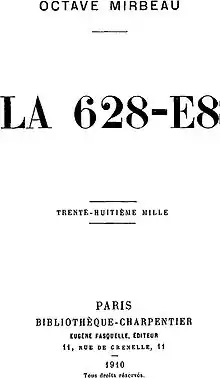 La 628-E8 is a novel by the French novelist and playwright Octave Mirbeau, published by Fasquelle in 1907. Part travelogue, part fantasy, part cultural commentary and critique, Mirbeau's book highlights its own unclassifiability: "Is it a diary?”, the narrator wonders. "Is it even the account of a trip?”