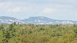 With an estimated age of 1.88 billion years, the La Cloche Mountains consist of metamorphosed quartz sandstone, which accumulated and was deposited in the Georgian Bay region of Ontario 2.5 billion years ago.[2] The mountains themselves were formed during the Penokean Orogeny, a mountain-building stage in the Canadian Shield's geological history.[3] During this time, the sandstone that had accumulated was compressed and heated to form the white Quartzite which dominates the landscape today. The hills comprising the La Cloche Mountains are believed to have once been higher than today's Rocky Mountains, and were eroded down to their current altitude of 539 meters[4] at its peak. They remain among the highest altitudes in Ontario.