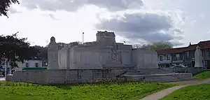 The memorial was built on land given by Adrien Fizeau, former mayor of Jouarre, in memory of his father Hippolyte Fizeau (1819–1896), a member of both the Institut de France and of the Royal Society. The Fizeau connection is commemorated by bilingual inscriptions either side of the steps leading up to the river-facing side of the memorial. This memorial was one of only four free-standing (outside proposed permanent war cemeteries) British World War I memorials to the missing eventually built on French soil. There had originally been proposals by the Imperial War Graves Commission to build 13 free-standing memorials to the missing in France, but this was eventually reduced to four: the Thiepval Memorial to the Missing of the Somme, the Neuve-Chapelle Indian Memorial to the Missing of the Army of India, the Soissons Memorial to the Missing that fell in the German offensives in 1918, and this memorial at La Ferté-sous-Jouarre to the Missing of the Marne.[2] This memorial was the only one of the four where the design was opened to competition. The winning design was by the minor war cemetery architect Major George Hartley Goldsmith MC, who had studied under Sir Edwin Lutyens.[3]