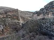 Typologically, the Pared de los Moros is classified as a gravity dam with an irregular layout.[3] The design is polygonal, consisting of five sections with varying orientations, adapting to the rocky terrain. The dam has a maximum width of 2.65 meters in its central part, a preserved height of 8.4 meters at its tallest point, and a length of approximately 68 meters at the top of the structure.[4]