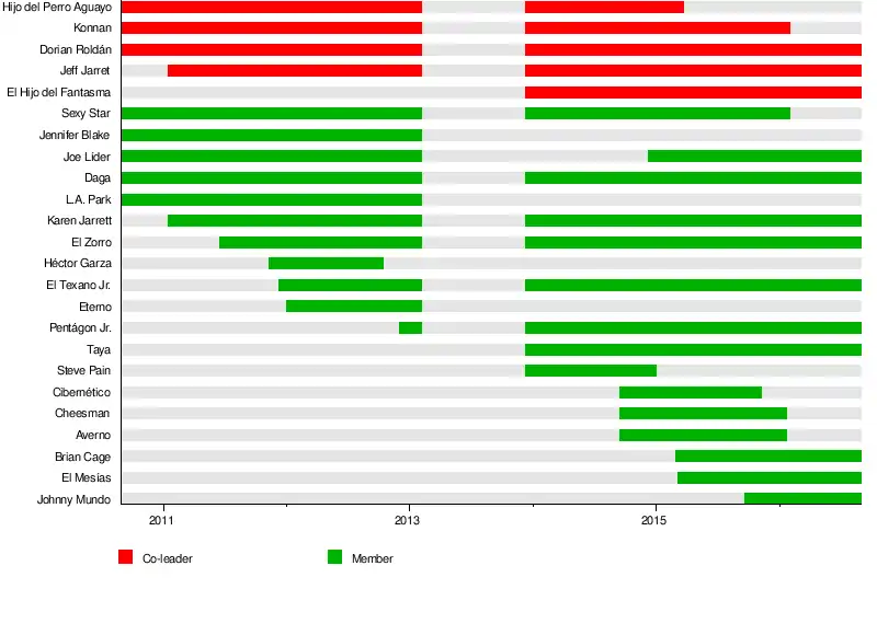 A second incarnation of La Sociedad, La Nueva Sociedad ("The New Society"), was formed on December 8, 2013, at the end of Guerra de Titanes by the returning Dorian Roldán and Konnan, Daga, El Hijo del Fantasma, El Hijo del Perro Aguayo, Jeff Jarrett, Karen Jarrett, Psicosis, Sexy Star, Silver King, El Texano Jr. and El Zorro.[62] Prior to Guerra de Titanes, El Hijo del Perro Aguayo had effectively become a técnico, forming a partnership with former rival Cibernético, which led to Los Perros del Mal turning on him. It was also suggested that Konnan, whom Aguayo considered his brother, would join him as a técnico.[63] At Guerra de Titanes, Aguayo turned on Cibernético, El Mesías and La Parka following a main event eight-man tag team match, attacking the three along with El Consejo and Los Perros del Mal. This led to El Zorro, who had recently returned to AAA, running out, but instead of saving the técnicos, he also turned on them, joining the rudos. La Nueva Sociedad was completed by Sexy Star, who returned from her maternity leave during the event, saving Karen Jarrett from Faby Apache, before the new group was formally introduced by Roldán.[62][64] In February 2015, Los Hell Brothers (Averno, Chessman and Cibernético) joined La Sociedad.[65] In May, longtime rival of La Sociedad, El Mesías, turned rudo and also joined the stable.[66] On September 20, Konnan stepped down as the leader of La Sociedad with El Hijo del Fantasma announced as his replacement. Meanwhile, Johnny Mundo became the newest member of the stable.[67] The group disbanded in 2016.