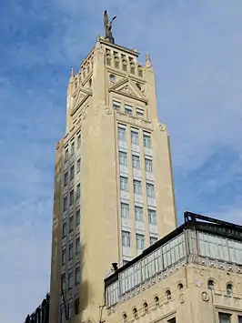 It is located on the corner of Alcalá street and Virgen de los Peligros street. It was built between 1928 and 1931, based on the project of the Spanish architect Modesto López Otero,[1] with the collaboration of Miguel de los Santos.[2] Valentín Vallhonrat company carried the works out.[3] The authorship of the sculpture that pinnacles the building refers to «sculptor Camps»,[1] whose identity is doubtful, it is unknown whether it is related to Vicente Camps Bru or Josep Maria Camps i Arnau.[4] The building site was acquired for two millions of pesetas in 1928.[1] One of the keys of the project was the integration of the new skyscraper in a harmonic way with the adjacent church of Las Calatravas, both have shaped an urban entity.[5] It is one of the more notorious works of López Otero[6] and its design involves an evolution from López Otero's "regionalist eclecticism" of his first works to a more «mature» style, after traveling to United States or Vienna.[6]