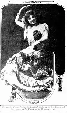 When she toured with her "Spanish Dance" her publicity claimed she was a famous Spanish dancer and singer who at the age of 15 was the premier danseuse at the Teatro Real in Madrid. More credible accounts indicate she was born Hazel Wolf to a traveling salesman and his wife and claimed Portland as her home town.[1] Accounts of her divorce give her married name as Mrs. Hazel Gertrude Phipps, daughter of Mrs. Marie Dowd.[2] Phipps married her when she was a student at St. Margaret's, San Mateo.[1] She reportedly "returned" to Spain as a teenager.