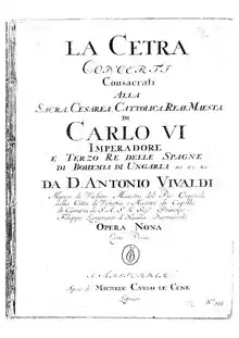 La cetra, Op. 9, is a set of twelve violin concertos by Antonio Vivaldi, published in 1727. All of them are for violin solo, strings, and basso continuo, except No. 9 in B flat, which features two solo violins. The set was named after the cetra, a lyre-like instrument, and was dedicated to Emperor Charles VI.[1]