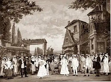 The biggest draw at the Gaîté was its leading lady, Jeanne Granier, for whom Audran and his partners wrote the role of Thérèse, the extravagant, feckless heroine. The mezzo-soprano lead, Charlotte, the thoughtful "ant", was sung by Louise Thuillier-Leloir, for whom the collaborators had written before, in Le grand mogol (1884) and Pervenche (1885).[7] La cigale et la fourmi opened on 3 October 1886 and ran for 141 performances, taking just over half a million francs at the box-office, putting it roughly on a par with Le grand mogol but not approaching the success of La mascotte.[8]