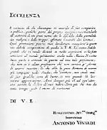 La stravaganza [literally 'Extravagance'] (The Eccentricity), Op. 4, is a set of concertos written by Antonio Vivaldi in 1712–1713. The set was first published in 1716 in Amsterdam and was dedicated to Venetian nobleman Vettor Delfino,[1] who had been a violin student of Vivaldi's.[2] All of the concertos are scored for solo violin, strings, and basso continuo; however, some movements require extra soloists (such as a second violin and/or cello solo).