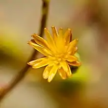 Flower heads appear dandelion-like, attach at the apex of the stem, and are 8mm across. The florets are yellowish or slightly red to orange in color, consisting of 12-25 per plant. The base of the flower head has several floral bracts that appear light green and glabrous. Flowers bloom in late summer or early fall for approximately 3–4 weeks. The flower does not seem to emit noticeable scent. After the blooming period, flowers are replaced by dark achenes with tufts of white hair. Its achene has a longitudinal ridge, may have black spots on either side, and are distributed by the wind. They are ovoid; slightly flattened, but curved in shape. A plant may have buds, flowers, and achenes simultaneously. Roots are a thick deep taproots that contain a white latex that is apparent when cut.[6]