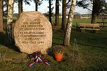 From November 1, 1944 until December 16, 1944, a concentration camp was established near Ladelund.[2] The prisoners were mostly Dutch, Polish, Soviet, French, Italian, Belgian and Czechoslovak.[2] In the six weeks of being in production 301 people died through hard labour, starvation and infection diseases. Among the deaths were also 111 Puttenaren, men from the village Putten in the Netherlands, who got deported during the Putten raid because the action was undertaken as a reprisal for a Dutch resistance attack on a vehicle carrying personnel from the Wehrmacht. It was one of the worst raids in occupied Netherlands during the Second World War.[3] Ladelund was a subcamp to the Neuengamme concentration camp.