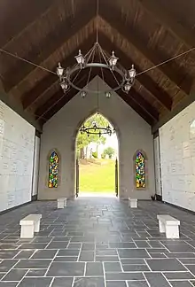 In 1876, the Gothic Revival stone structure designed to look like a ruined medieval tower was built at the entrance to house the chapel, office and receiving vault.[33] In 1915, the original entrance was closed and the present one was opened to better facilitate cars.[34]