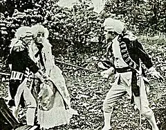 The film's storyline was set in the colonial period of the United States in the early 1770s.[8] Reviews and plot summaries of the featurette published in late 1913 and 1914 describe the portrayal of a romance set within a province marked by public opposition to the local government. The story involves Lord Primton (Frederick C. Truesdell), an important landowner who lives on his estate with his widowed sister (Julia Stewart) and her niece, Lady Babbie (Barbara Tennant). The nobleman despises a new, exorbitant tax levied on citizens by Governor Dunmore. To gather allies to discuss a plan of action against the tax, Primton invites his friends to a lawn party, hoping such a common social event will not arouse the suspicions of government officials. At the party a young British officer, Lieutenant Byron, meets Lady Babbie and falls immediately and deeply in love with the beautiful woman. Their obvious attraction for one another is resented by her fiancé, who is an army officer as well. Rising jealousies soon prompt the fiancé to challenge Byron to a duel. When Babbie learns of the challenge, which is to take place at midnight at a nearby crossroads, she tries to stop it. She disguises herself in men's clothing, goes to Byron, and pleads with him not to fight. Her fiancé finds them together again, becomes furious, and draws his sword. Byron counters with his own sword, and in the ensuing clash he kills the fellow officer.