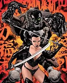 For failing to assassinate the Punisher, Gorgon was expelled from the Hand. In an attempt to reclaim her honor, Gorgon hires three members of the Shaolin Scientist Squad to help her murder the Punisher, who had since become a Frankenstein's monster-like entity called Franken-Castle. Franken-Castle kills two of the Shaolin Scientist Squad members, while the third is shot in the head from afar by Gorgon to prevent him from being interrogated by Franken-Castle.[9] Gorgon retreats to Tokyo, where she acquires the Izanami-no-Mikoto Sword, a Hand relic that she believes can earn her acceptance back into the organization. Franken-Castle locates Gorgon, and their ensuing battle brings them to the Hand's base in Kabukichō, where Gorgon is impaled with the Izanami-no-Mikoto Sword by her former master, Kazu Yoshiokya.[10][11][12]