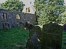 Margaret Hoby visited York and London several times during the years covered by her diary, but it makes little reference to public events. Margaret died on 4 September 1633 and was buried on 6 September in the chancel of St Peter's Church, Hackness, where her husband erected an alabaster monument to her. It survives, but St Margaret's Chapel in Harwood Dale, which Hoby also built to her memory, is in ruins.[1] Her husband died in 1640 leaving his manor at Hackness to the son of his first cousin named John Sydenham, whose son, Sir John Posthumous Sydenham, erected a monument to Hoby in Hackness Church. There is also a memorial window to him in All Saints' Church, Bisham, Berkshire.[9]