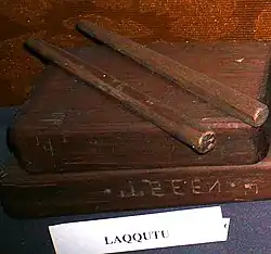 The Lagguti, Lakto, or Laggutu is a Talysh[1] folk percussion slit drum instrument performed in southern regions of Azerbaijan: Lerik, Astara, Lankaran, Masalli and Jalilabad.