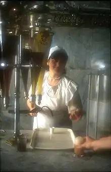 Laghidze water is named after Mitrofan Laghidze, a pharmacist's apprentice in Kutaisi, Georgia, who in 1887 explored the idea of using natural syrups instead of imported flavored essences in making lemonades. In 1900, the Lagidze Brothers plant in Kutaisi began blending unique proprietary flavors from herbs and fruits.[4] Today, Lagidze waters are produced in a wide range of natural flavors, including quince (aiva), pear, citrus fruit, cherry, tarragon, and others.[2] Lagidze waters are distributed in Russia, Ukraine, the three Baltic states, Poland, and Armenia.[5] The technology and culture of the Lagidze Waters were inscribed on the Intangible Cultural Heritage of Georgia list in 2014.[6][7]