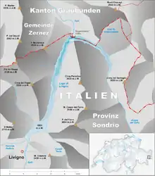 Lago di Livigno or Lago del Gallo is a reservoir in the Livigno valley. The reservoir is mostly in Italy whereas the Punt dal Gall arch dam is crossed by the border with Switzerland (Zernez, Grisons).
