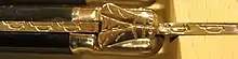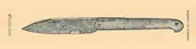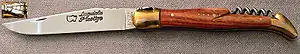 The major influence on the form of the classic laguiole is most likely the Arabo-Hispanic clasp knife of Andalusian Spain, the navaja.[1][2][3] The laguiole was first designed in 1829 by Jean-Pierre Calmels. The earliest forms of laguiole knife were straight-bladed and handled, the so-called laguiole droit; the classic navaja-like laguiole seems to have been developed around 1860. The Calmels laguiole droit had a 'half-lock' on the blade where a small projection on the end of the backspring (mouche) exerts pressure on a corresponding indent in the heel of blade when the knife is open; this, and not the full locking system of the navaja, remained a fixed feature in subsequent laguiole knives. Seasonal migrations of shepherds and cattle herders between Catalan Spain and southern France in summer and winter introduced the navaja to France.[2] The Arabo-Hispanic design of the navaja was merged with that of local folding knives represented by older patterns such as the laguiole droit and Capuchadou; the result became the classic laguiole. In 1840, the first awl or trocar (a surgical instrument used to puncture body cavities and relieve the suffering of cattle and other animals with bloat) was added to the some laguiole knife patterns. In 1880, some models of the laguiole began featuring a corkscrew, in response to demands from the owners of bars in the Auvergne, and restaurants in Paris.[4]