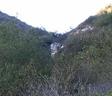 The rock ledge that Laurel Canyon Creek spills over during heavy rainfall, viewed from lower on the Laurel Canyon Trail.
