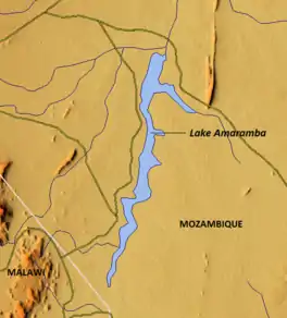 Lake Amaramba (Portuguese: Lago Amaramba) is a shallow lake in Mozambique, near the border with Malawi. Located in the Nyasa plateau, it is north of Lake Chiuta.[1] The lakes are separated by a sandy ridge and a channel links the two lakes. On the western side of the channel, the connecting waterway is known as the River Msambiti while on the eastern side, it is known as the Lugenda River.[2] Lake Amaramba is intermittently linked to the Lugenda River, a tributary of the Ruvuma River.[3]
