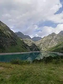 Lago del Barbellino is the largest artificial lake in the Province of Bergamo, Lombardy, Italy. It is located in Valbondione among the Bergamasque Alps. The reservoir contains 18.5 million cubic metres of water. In 1931 a dam was built to supply hydroelectric power to the Seriana Valley where the textile industry was rapidly developing.[1]