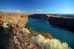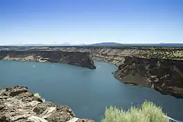 The canyon in which Lake Billy Chinook lies was carved by the three rivers that flow into the lake. The Deschutes Formation into which it is carved began forming about 11 million years ago, as alternating layers of basaltic lava, stream sediment, and volcanic debris flowed into the area from the Cascade Range.[4] One to three million years ago, lava flows from the Cascades and Newberry Volcano capped the exposed material, forming the "rimrock basalt" which is visible atop the canyon. Further erosion by the three rivers, volcanic activity, and wind have continued to form and erode the canyon.[5]