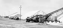 Efficiency of transportation was improved in 1926 after a 9 km (5.5 mi)[12] branch line was built from the nearby Salisbury railway line,[13] enabling transport directly to Port Adelaide.[10][note 2] During World War II, when salt was need for munitions manufacture, employment rose from 30 to 100 workers, with three shifts a day, and two trains a week transported the product in bags.[14] In 1967, 1000 tonnes a day were harvested; at that time South Australia was producing 80 per cent of Australia's salt, although that soon decreased, with major expansion of solar salt production in Western Australia. Forty years later, average annual production was reported as 10,000 tonnes (11,000 tons).[9] From 1996 to 2012, the works closed and no salt was harvested.[14] With harvesting becoming practicable using only front-end loaders and trucks, the maintenance and salt works buildings became redundant and were demolished in 2000.[7][8]