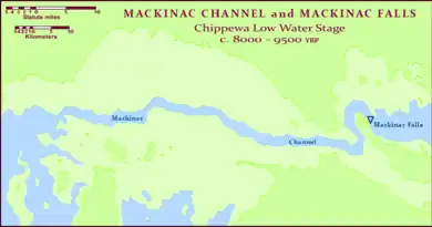 Somewhat smaller than Lake Michigan, Lake Chippewa extended through the most of the Michigan Basin, north to the Straits of Mackinac, where there was a narrow channel which conveyed the lake's outflow over the now submerged Mackinac Falls to Lake Stanley. Its shoreline ranged from 10–30 miles (16–48 km) out from the present day Lake Michigan shore.