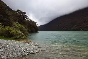A small lake between Lake Te Anau and Milford Sound, it lies adjacent to the State Highway 94 (SH94; the Milford Sound Road). The lake is within the boundary of the Fiordland National Park, and is surrounded by native bush. The west branch of the Eglinton River flows through the lake, and it drains into Lake Gunn located south of it.[1]