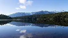 Like nearby Lake Matheson, Lake Gault is dystrophic: its water is stained brown in colour with tannins leached from surrounding forest, low in nutrients, acidic, and has a sparse and specialised phytoplankton.[4][5] And as in Lake Matheson the dark water creates spectacular reflected views of the Southern Alps, especially Aoraki / Mount Cook and Mount Tasman.[6][7]