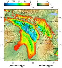 - ↑ National Geophysical Data Center (1999). "Bathymetry of Lake Huron". National Oceanographic and Atmospheric Administration. doi:10.7289/V5G15XS5. Retrieved March 23, 2015.
