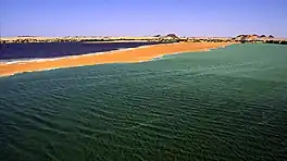 The Lake Katam is one of the larger lakes in Ounianga Kebir, a lake system in the Borkou-Ennedi-Tibesti Region in the north-east basin of Chad. These lakes are notable for their running in the north–south headlands, by the Trade wind are formed. They are the remnant of a much larger lake, that filled the basin during the so-called green Sahara-time, which lasted from about BC 10000–1500.