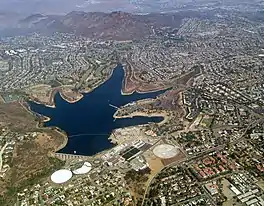 Lake Murray is a reservoir in San Diego, California, operated by the City of San Diego's Public Utilities Department. Although thinly divided by a few housing communities and select roadways, it is technically considered to be part of the jurisdiction which makes up Mission Trails Regional Park. When full, the reservoir covers 171.1 acres (69.2 ha), has a maximum water depth of 95 feet (29 m), and a shoreline of 3.2 miles (5.1 km).[1] The asphalt-paved service road lining roughly two-thirds of the lake's perimeter is a popular recreation site for the Navajo community as well as residents of the northernmost neighborhoods in La Mesa. It lies south of Cowles Mountain and a small golf course. It also functions as an important aeronautical reporting point for aircraft inbound to land at Montgomery-Gibbs Executive Airport (identifier: KMYF).