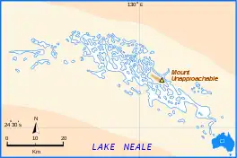Lake Neale (together with Lake Amadeus, Pitjantjatjara: Pantu[2] ("salt lakes")) is a salt lake in the southwest corner of the Northern Territory of Australia. It is on the north-western side of Lake Amadeus. The two lakes form part of a chain of salt lakes that stretches about 500 km (310 mi), from Lake Hopkins in the west to the Finke River in the east.[3] This drainage basin is known as the Amadeus Basin.[4] The lake is usually a dry salt pan, and only holds water for short periods after heavy rainfall. Lake Neale is on Aboriginal land, held in the Petermann Aboriginal Land Trust. The Haasts Bluff lands are nearby to the north.[5]