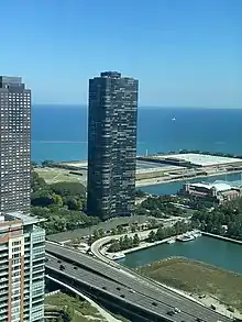 Lake Point Tower is a residential skyscraper located on a promontory of the Lake Michigan waterfront in Chicago, just north of the Chicago River at 505 North Lake Shore Drive. Completed in 1968, it is in the Streeterville neighborhood on the Near North Side. Located adjacent to Navy Pier, the building is the only skyscraper in the city east of Lake Shore Drive.