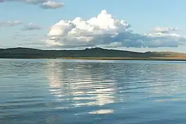 Lake Shira is a meromictic lake (the water layers do not mix), located in the Republic of Khakassia, Russia. The lake covers an area of 39.5 km2 (15.3 sq mi) in a steppe landscape in the Minusinsk Hollow. Height above sea level 353 m (1,158 ft), a relatively flat intermountain area 160 km northwest of the city of Abakan. The village for which it is named, Shira, is 12 kilometers (7.5 mi) to the west. The southern and western shores feature beaches popular for local recreation (the bottom is sandy), and spas that take advantage of the mineral water. Lake Shira is a salt lake with a high magnesium content. It has one small river providing inflow, but no outflow, although geographically the lake is in the Yenisei River basin. The northern shore is protected by the Khakasski Nature Reserve.[1]