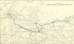 The LSE was formed in 1901 and was composed of four predecessor streetcar and interurban lines, all owned by the Everett-Moore Syndicate. The Lake Shore Electric operated a 60-mile route between Cleveland and Toledo. In 1907, the company constructed a cutoff between Sandusky and Fremont, Ohio, which reduced the distance between Cleveland and Toledo by five miles and decreased travel time by 30 minutes. The old and the new routes were operated with hourly passenger service where a two-car interurban from Cleveland separated at Sandusky and recoupled at Fremont to continue to Toledo. This service continued until 1939.[1]