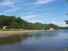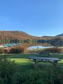 The eastern portion of its shoreline is occupied by Mount Orford National Park for approximately 12 km.[18] Two sectors of the park are involved: the Jouvence sector and the Lac-Stukely sector. The latter includes a 358-site campground, some of which are lakeside, as well as a popular beach.[16][19] Its 2,500-person capacity is often reached.[20] There is also a boat launch for small craft.[19] The Jouvence sector surrounds the resort of the same name, where outdoor activities with accommodation are practiced.[21]