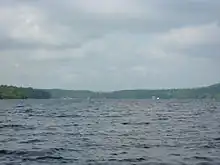 The lake itself covers an area of 4 km2, with an average depth of 13 m and a maximum depth of 32 m.[12] Its greatest dimensions are 5.3 km in length and 1.6 km in width,[12] with an estimated water volume of 53,100,000 m³.[12] Lake Stukely is 285 m above sea level.[15] The lake's main island is Miner Island[16] (surface area 19 acres or 0.077 km2), part of the Mount Orford National Park territory.[8]