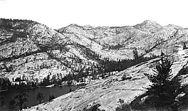 ![]() North across the upper part of Lake Vernon, which lies in a region of prevailing massive granite. Mahan Peak on the right. | |