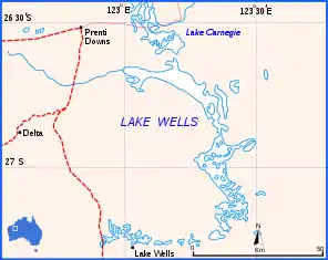 Lake Wells is an ephemeral salt lake in the centre of Western Australia, lying in close proximity to Lake Carnegie.[1] It lies east of Wiluna and is at the southern edge of the Little Sandy Desert and south western border of the Gibson Desert. It also lies to the north west of the Great Central Road and the Great Victoria Desert. Its surface elevation is 436 metres above mean sea-level.[2] Lake Wells has an area of 1895 square kilometres.[3]