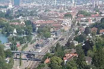At the same time as the Hirschengraben tunnel was constructed, the Zürichberg tunnel was constructed in order to link Stadelhofen station with the Zürich to Winterthur and Wallisellen to Rapperswil via Uster lines. As a consequence the section of the right bank line between Zürich Hbf and Stadelhofen is now part of the backbone of the Zürich S-Bahn, carrying no fewer than eight separate routes.[1][2]