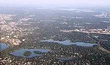 Lake of the Isles (Dakota: Wíta Tópa, "Four Islands"[1]) is a lake in Minneapolis, Minnesota, connected to Cedar Lake and Bde Maka Ska. The lake is part of the city's Chain of Lakes and has an area of 109 acres (0.4 km2), 2.86 miles (4.6 km) of shoreline with a little under three miles of paved walking and biking paths, and a maximum depth of 31 feet (9 m). Lake of the Isles is known for its two wooded islands, its long north arm, and the surrounding stately houses of the Kenwood, Lowry Hill, and East Isles neighborhoods.