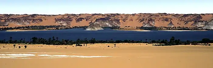 The Lakes of Ounianga (French: Lacs d'Ounianga, Arabic: بحيرات أونيانجا, romanized: Buḥayrāt ʾUniyāngā) are a series of lakes in the Sahara Desert, in North-Eastern Chad, occupying a basin in the mountains of West Tibesti and Ennedi East. It was added as a UNESCO World Heritage site in 2012.[2]
