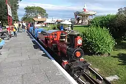 Early photographs variously name the southern terminus White City,[5] Marine Drive[6] and Lakeside,[7][8][9] but it has been referred to as the Pleasureland terminus for many years.[10][11] In 2020 there were two workshops and an engine shed here, with a single island platform serving two running lines with run-round loops which converge to form the running line alongside the lake.[12] There is also a third siding for stock storage. In 2020 Pleasureland made significant investment in this terminus, adding a short platform on the eastern runround loop, a refreshment kiosk, a traditional roundabout and a helter-skelter, all aimed at the families with young children market.