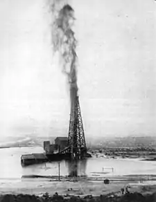 ![]() The Lakeview gusher with a lake of crude oil surrounding the derrick, mid-1910 | |