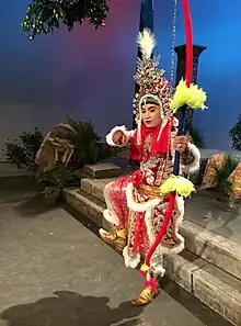 It is derived from Chinese opera which explains some of the costumes, modified face painting, musical instrumentations (drums, gongs, chimes, and wood blocks), singing dialogues, acrobatics and fighting. Musically it appears similar to pinpeat versions of Vietnamese cải lương.[1] Dances in Lakhon Bassac are often popularized versions of Lakhon Kbach Boran (Khmer: ល្ខោនក្បាច់បូរាណ), a classical court performance.[1][2] Repertoires come from Jataka tales and local legends,[2] and sometimes by localizing dramas from China, Vietnam, and France, "such as altering the villains in Vietnamese hát bội from Chinese to Vietnamese!"[3]