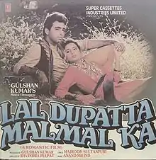 Lal Dupatta Malmal Ka is a 1989 Hindi made-for-television movie. Although it was just a telefilm and not released on the big screen, it was a huge success.[1] The movie is known for its popular songs sung by Anuradha Paudwal, Udit Narayan, Mohd. Aziz. The music for the songs was provided by Anand–Milind. It starred Sahil Chaddha and Veverly in leading roles. A sequel titled Phir Lehraya Lal Dupatta Malmal Ka was made later that year with Sahil and Veverly reprising their roles.