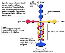 In cell adhesion laminin-111 and other isoforms are important proteins that anchor cells to the extracellular matrix (ECM).[8] The linkage between cells and the ECM is formed by binding cell surface receptors to one end of the laminin α chain and binding ECM components to another region of the laminin.[8] Globular domains (G-Domain) of the α chain are the regions on laminin-111 that allow the binding of integrins, glycoproteins, sulfated glycolipids and dystroglycan.[8]