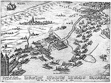 Lammenschans refers to a former fort located in Leiden along the Vliet. In October 2020 remains of the fort were found near a modern bridge called Lammebrug, about half a kilometre more southerly than earlier assumed (52.1404°N, 4.4878°E).[1] According to local legend, a large Spanish cooking pot filled with hutspot was found there on 3 Oktober 1574 by Cornelis Joppenszoon after the Spanish forces fled at the conclusion of the Siege of Leiden. Later historians have concluded that this pot, which today is in the collection of the Museum De Lakenhal, was actually found by Gijsbert Cornelisz. Schaeck and was engraved with the story by his son in the 17th century.[2][3] A statue of Cornelis Joppensz with his pot can be seen at the train station today. The Leiden rescue, or Leidens Ontzet is celebrated each year in Leiden on October 3.
